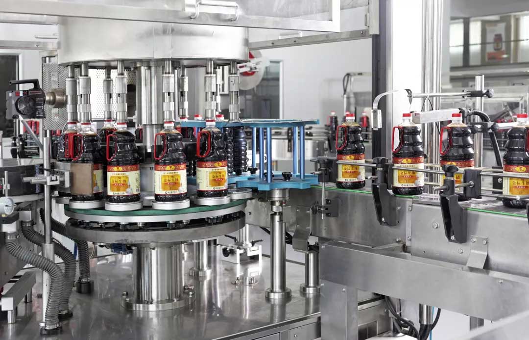 廣味源的醬油產(chǎn)品經(jīng)高溫滅菌灌裝后,進行自動化貼標