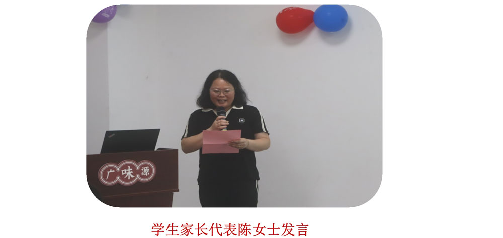在這么一個(gè)有意義的日子里,我們邀請(qǐng)了三位學(xué)生的家長(zhǎng)一同參與,并見證他們的高光時(shí)刻,讓他們感受到了畢業(yè)禮濃郁的氣氛,且有幸邀請(qǐng)到一位學(xué)生家長(zhǎng)代表陳女士上臺(tái)為我們19位畢業(yè)生送上了最真摯的祝福和期望!